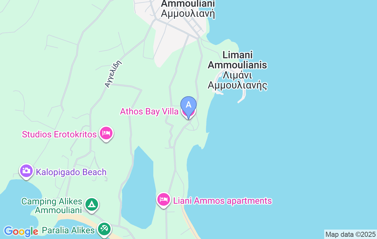 Athos Bay Villa je udaljena od luke 800m, od centralnog trga 950m, dok udaljenost luke, iz koje polaze trajekti za ostrvo Amuljani, od najbližeg aerodroma u Solunu, iznosi 110km.