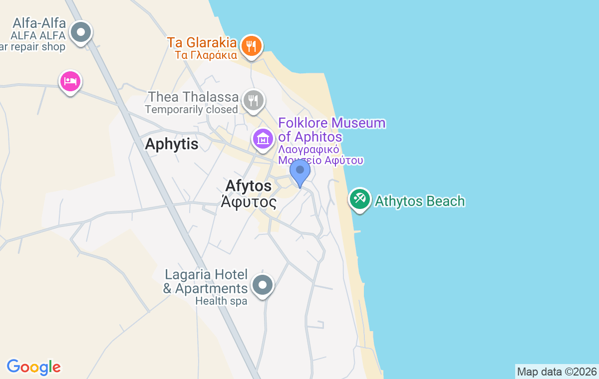 Anastasia House se nalazi u slikovitom i romantičnom turističkom mestu Afitos, na severoistočnoj obali poluostrva Kasandra, na 450 m od peščane plaže i na 30 m od centralnog trga. Smeštaj je idealan za porodice i grupe prijatelja koji žele miran i opuštajući odmor, uz lak pristup lokalnim sadržajima i prijatnu atmosferu Afitosa.
