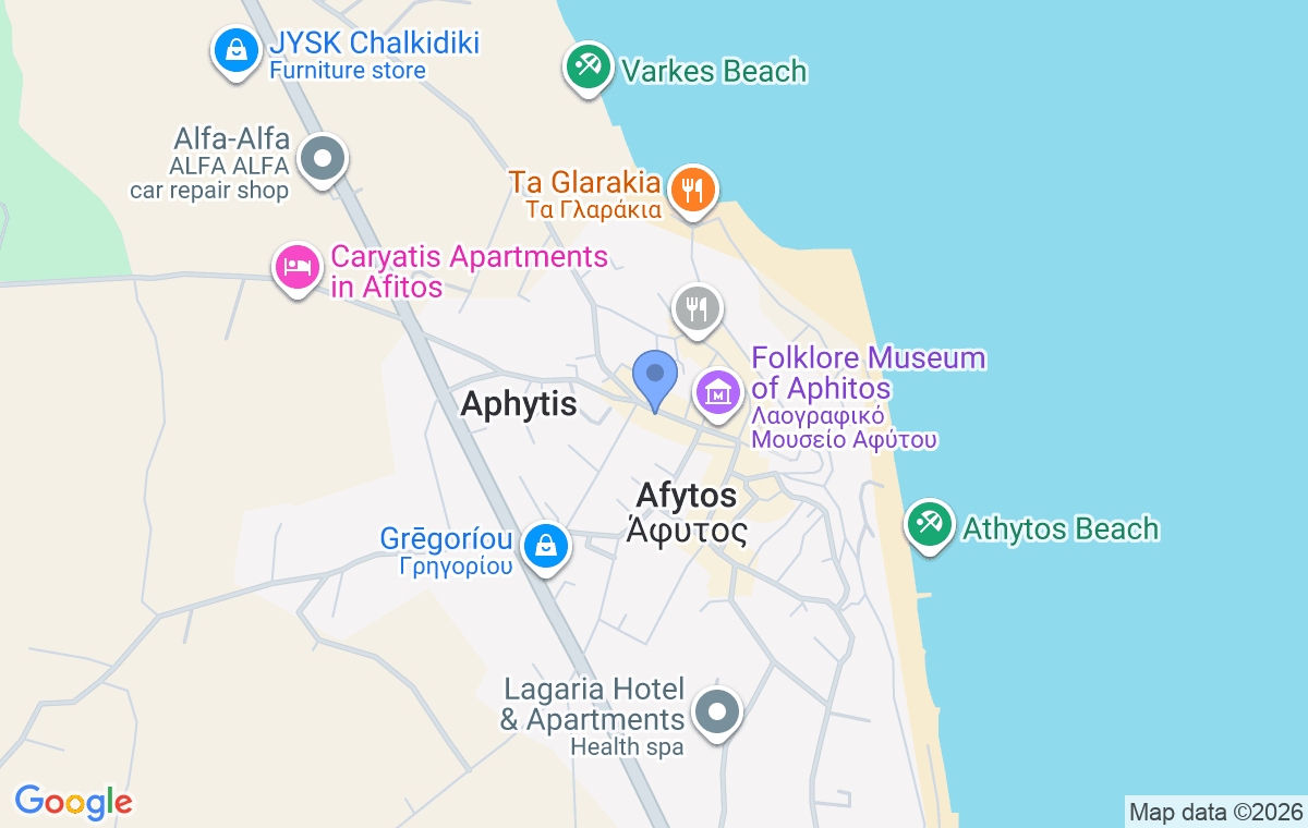 InLofts Apartments nalazi se u mestu Afitos, jednom od najlepših i najšarmantnijih naselja na poluostrvu Kasandra, poznatom po tradicionalnoj arhitekturi, kamenim ulicama i prelepom pogledu na Toronejski zaliv. Smeštaj je udaljen oko 800 metara od uređene kamene plaže sa kristalno čistim morem. Objekat je smešten u mirnom delu mesta i okružen uređenim dvorištem, pružajući prijatan ambijent za opušten odmor u autentičnoj atmosferi Afitosa.