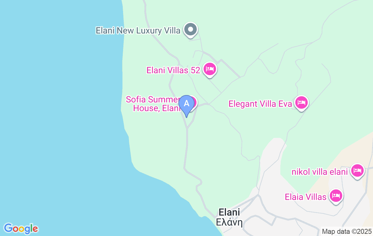 Na skretanju prema plaži Elani, skrenite desno (suprotno od obale), zatim nakon 20m levo i pratite put uzbrdo do prvih redova kuća. Kada prođete prvi red kuća u kompleksu, skrenite levo, pa nakon 50m desno i nastavite pravo još 100m do poslednje kuće na uzvišenju. Pored nje se nalazi prilaz uzbrdo kojim možete stići do smeštaja i parkirati ispred dvorišta. Five-Star Luxury Pool Villa je treća po redu u prvoj liniji kuća koje gledaju ka moru.