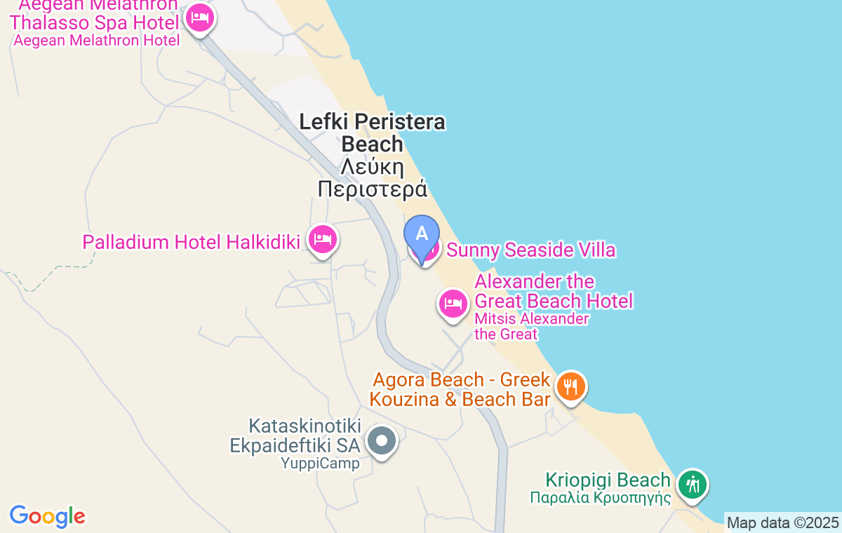 Dolazeći iz pravca Soluna, kada prođete Kaliteu i nastavite pravo ka Kriopigiju, videćete prodavnicu Exotic Market sa leve strane i nakon 400m skrenite levo ka smeštaju - postoji ostrvo koje odvaja magistralu od prilaza smeštajnom kompleksu u okviru kojeg se nalazi i Sunny Seaside Villa.
