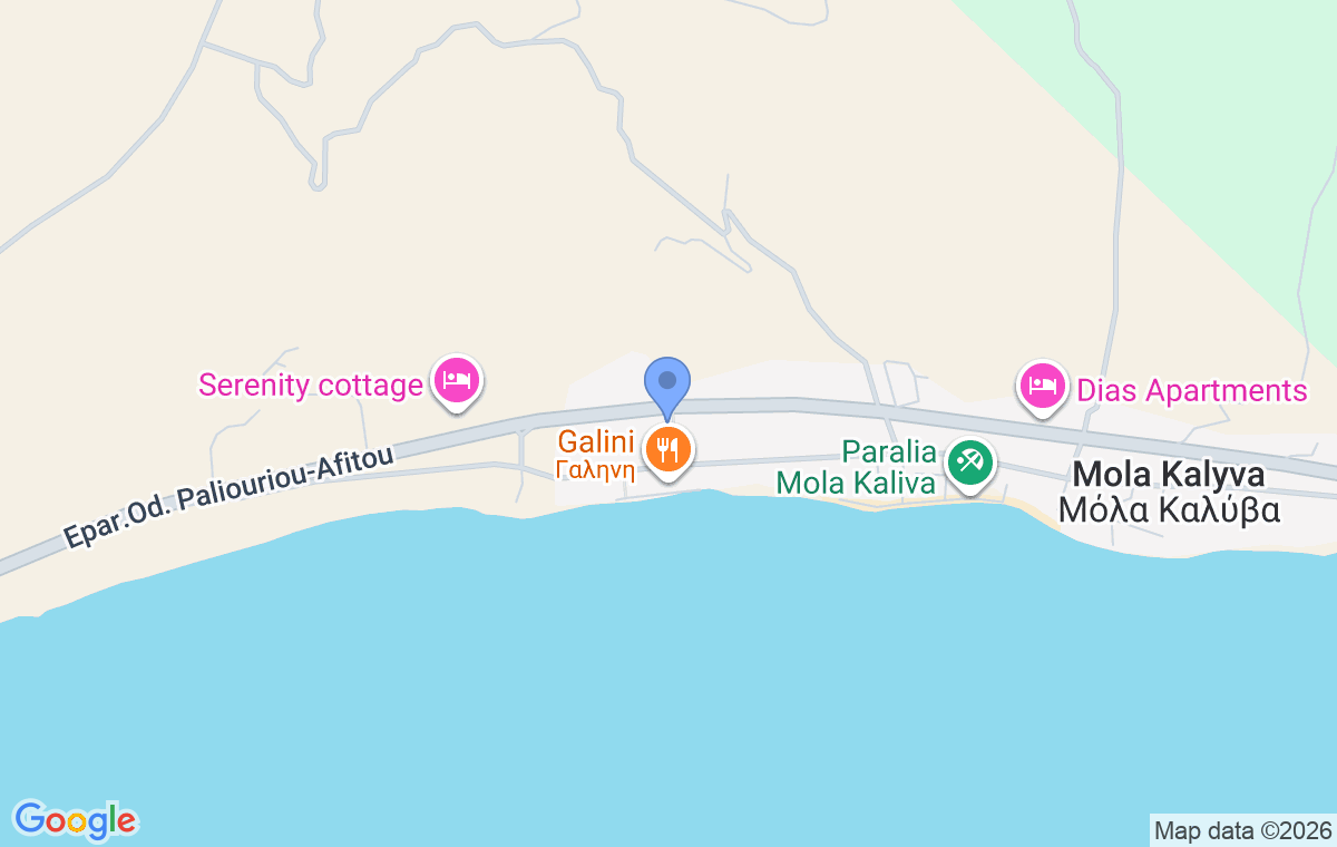Theros S Apartments nalazi se u Mola Kaliva, šarmantnom i mirnom ribarskom mestu na obali Kasandre, poznatom po kristalno čistom moru i opuštajućoj atmosferi bez velike gužve. Smešten na svega 120 metara od plaže, ovaj objekat nudi savršen spoj morskog vazduha i zelenila borova koji okružuju čitavo naselje.