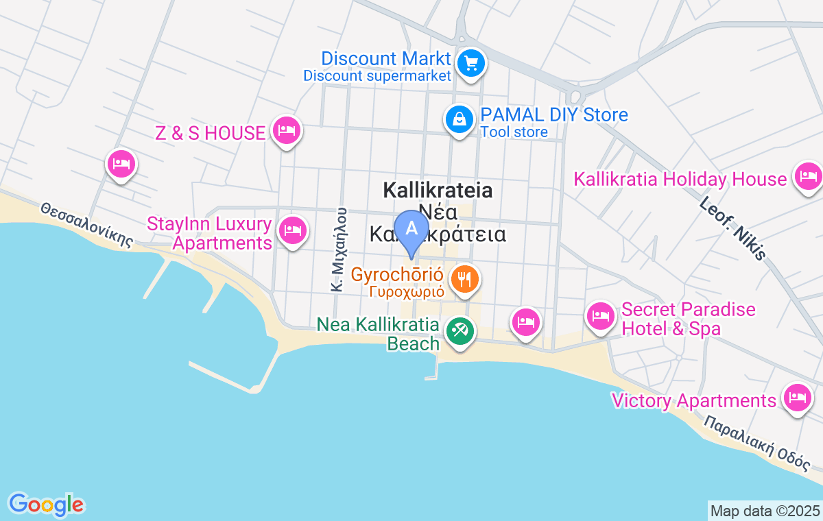 Central Beach Apartment je udaljen 30 km od letovališta Nea Potidea, a od najpopularnijeg letovališta na Kasandri, Pefkorija je udaljen 68 km, dok se od najbližeg aerodroma u Solunu nalazi na udaljenosti 34 km.