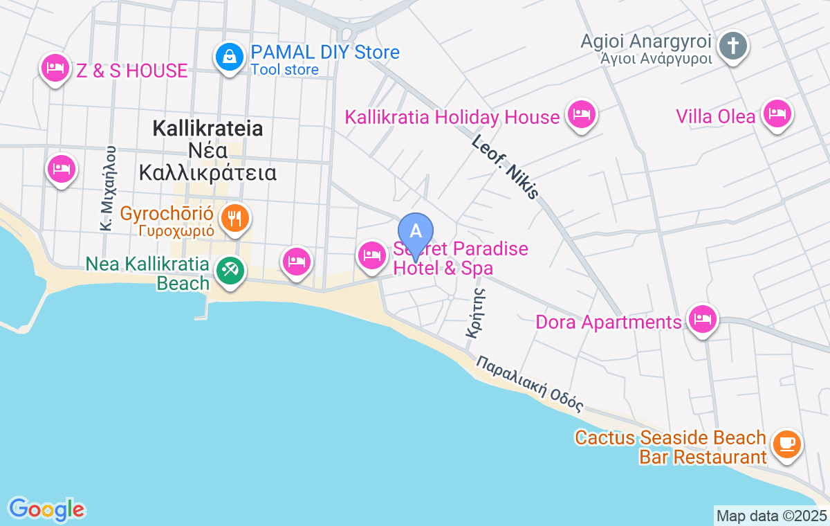 Nea Kalikratija je živahan gradić i popularno letovalište smešteno na samom početku poluostrva Kasandra na Halkidikiju, što je čini jednim od prvih većih mesta na koje naiđete putujući iz Soluna. Za razliku od mnogih turističkih mesta koja žive samo tokom sezone, ovo je pravi gradić sa svim potrebnim sadržajima koji funkcionišu tokom cele godine. Poseduje široku i dugačku peščanu plažu sa plitkim morem, idealnom za porodice sa decom, a duž plaže se prostire lepo uređeno šetalište sa brojnim tavernama, restoranima, kafićima, poslastičarnicama i barovima. Posebno su cenjeni prelepi zalasci sunca sa pogledom na planinu Olimp. Kao veće mesto, odlično je snabdevena, nudi sve potrebne radnje i usluge, a utorkom se održava pijaca sa svežim lokalnim proizvodima. Iako je živa i dobro posećena, zadržava prijatan osećaj, sa ulicama često punim dece i uređenim parkićima. Poznata je i po Kassandra Festivalu koji se održava u Amfiteatru Kasandra tokom leta, nudeći raznovrsne kulturne događaje, koncerte i predstave. Njena lokacija je izuzetno povoljna za dnevne izlete, omogućavajući lako istraživanje Soluna i drugih delova Halkidikija. Međunarodni aerodrom u Solunu udaljen je oko 35 km od smeštaja.