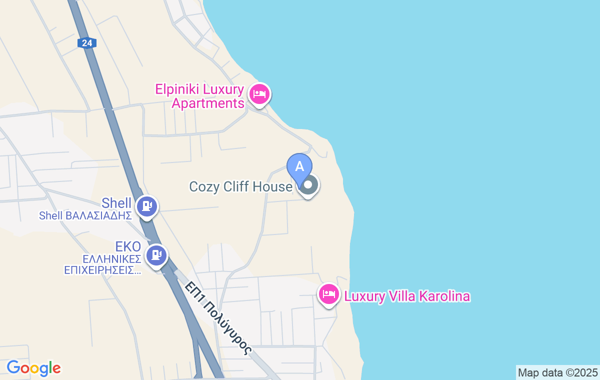 Dolazeći iz pravca Soluna, kada prođete EKO pumpu, sa autoputa se isključite kod znaka za sporedni put ka Nea Potidei, pređite preko nadvožnjaka i skrenite levo. Za 300m skrenite desno (donji asfaltiran put) i pratite put narednih 450m, sve do skretanja desno ka kompleksu kuća. Cozy Cliff House je treća kuća sa desne strane, gledano od ulaza.