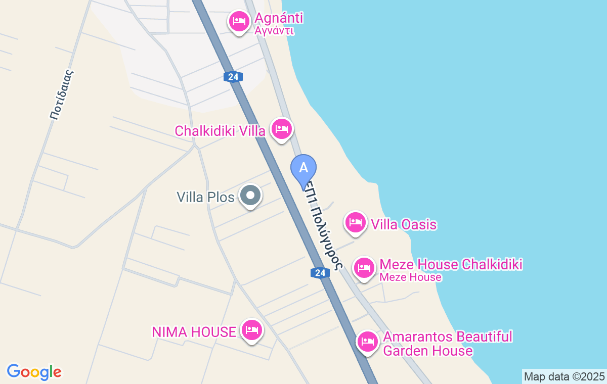 Smeštaj se nalazi na 5.5km izvan mesta Nea Potidea, u smeru ka Nea Fokei. Udaljen je 650m od najbliže plaže, a prve prodavnice, pekare i restorani su na oko 5km udaljenosti.