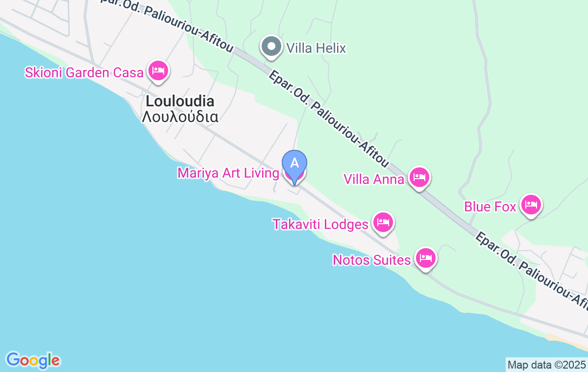 Mariya Art Living Apartments se nalazi u blizini primorskog sela Nea Skioni koje se prostire duž peščane obale, na južnom delu poluostrva Kasandra na Halkidikiju, a koje odlikuje bujna vegetacija pa je ovo mesto savršen izbor za one koji osećaju potrebu za spokojem, opuštanjem i privatnošću. Smeštaj je od najbliže plaže udaljen 150 m dok je od mesta Nea Skioni i plaže u mestu udaljen 2 km.