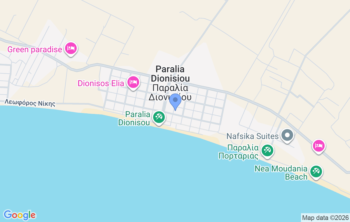 Paralia Dionisiou je manje i prijatno primorsko mesto na zapadnoj obali Halkidikija, smešteno između Nea Mudanje i Nea Potidee, sa otvorenim pogledom ka prostranstvu Toronejskog zaliva. Prepoznatljivo je po dugoj, pretežno peščanoj plaži sa postepenim ulazom u more, što ga čini pogodnim za porodice sa decom i goste koji preferiraju mirnije kupanje. Duž obale prostire se uređeno šetalište sa tavernama, kafićima i manjim prodavnicama, dok mala marina u centralnom delu mesta dodatno naglašava njegovu mediteransku atmosferu i vezu sa morem. Tokom letnjih meseci mesto dobija življi ritam, ali i dalje zadržava karakter nenametljivog letovališta bez izraženog noćnog života, što ga čini pogodnim za opušten odmor. Blizina većih centara omogućava jednostavan pristup dodatnim sadržajima i izletima, dok samo mesto nudi dovoljno mira, prostora i lokalnog duha za goste koji žele da borave nadomak mora u ambijentu koji nije preterano urbanizovan. Smeštaj je od međunarodnog aerodroma u Solunu udaljen oko 48 kilometara.