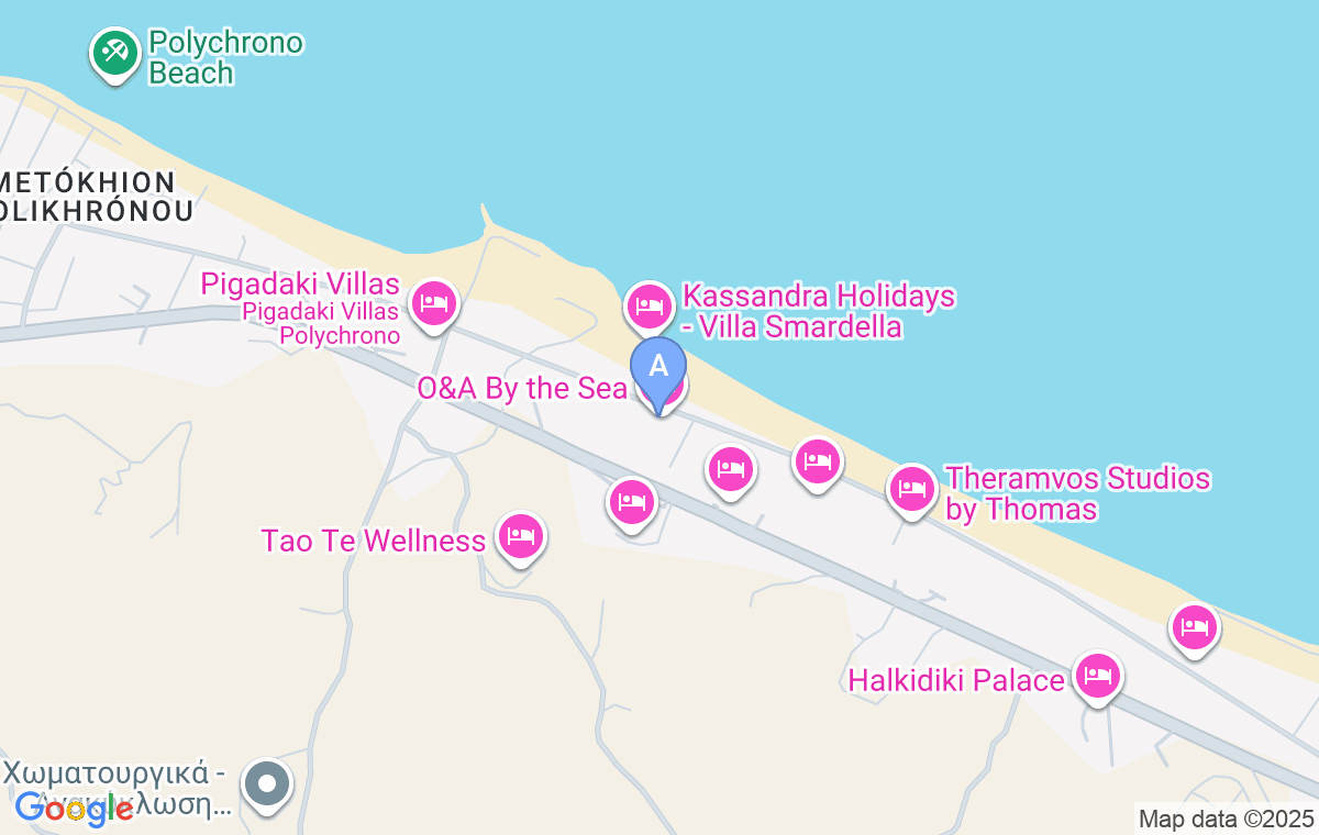 O&A By The Sea Apartments se nalazi u drugom redu od plaže, u mirnom delu Polihrona, okružen veoma lepim i ograđenim dvorištem, sa uređenim travnjakom savršenim za igru dece, ali i druženje s obzirom na to da postoji i roštilj sa stolom za ručavanje. Raspolaže sa dva renovirana (2018. god) dupleks apartmana, kapaciteta za 2-4 osobe. Nalazi se na samo 70 m od plaže, na kojoj nikad nema gužve. Smeštaj je otvoren tokom cele godine, a dobrodošli su i mali kućni ljubimci.