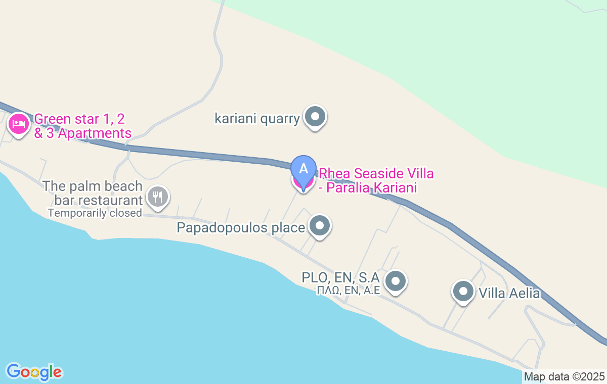 Rhea Seaside Villa nalazi se u primorskom mestu Kariani, na istočnoj obali plaže Ofrynio ili Tuzla, između Soluna i Kavale. Na raspolaganju vam je ceo objekat, tačnije kuća, sa prostranim dvorištem, kutkom za roštilj i pogledom na more iz daljine. Smeštena u mirnom delu, pruža vam komfor i prijatan odmor i idealan je izbor za porodice i prijateljska druženja. Najbliža plaža nalazi se na 250 metara od smeštaja.