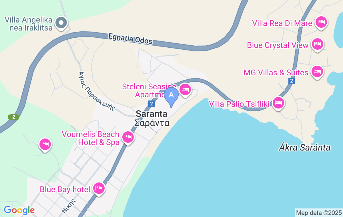 Kuća ima tri sprata (suteren, prizemlje i prvi sprat) i površinu od oko 300m2. Pogled na more se pruža sa prostranih terasa u prizemlju i na spratu. U vili može boraviti do deset osoba. Centar Nea Iraklitse je udaljen oko 2km.