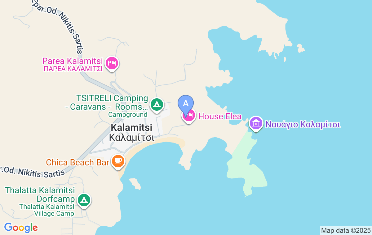 Ground Villa se nalazi u Kalamitsiju, malom i mirnom mestu na samom jugu Sitonije, na 180m od istoimene plaže koja je peščana. Duž plaže, na nekoliko minuta hoda od smeštaja, nalaze se mini market, taverne i barovi.