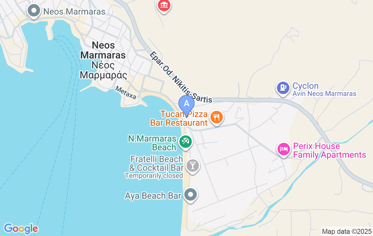 Smeštaj se nalazi u prvom redu do mora, samo je put između njega i gradske plaže. Najbliži market je na svega 300m, a gradski trg u Neos Marmarasu je udaljen oko 800m.