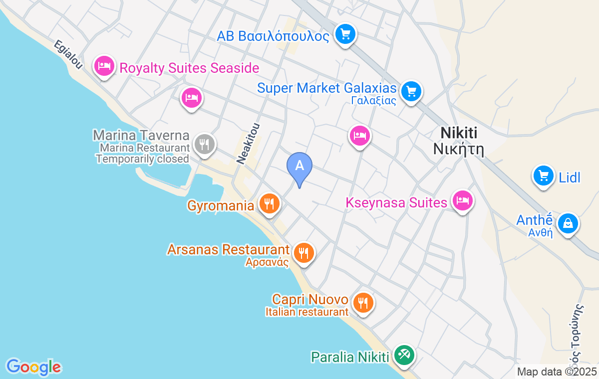 Mavridis Rooms ćete naći veoma lako. Posle semafora na ulazu u Nikiti skrenite desno u ulicu Neakitou i vozite pravo 600m. Kod igraonice za decu (sa leve strane) skrenite levo i produžite pravo još 240m dok ne stignete do smeštaja.