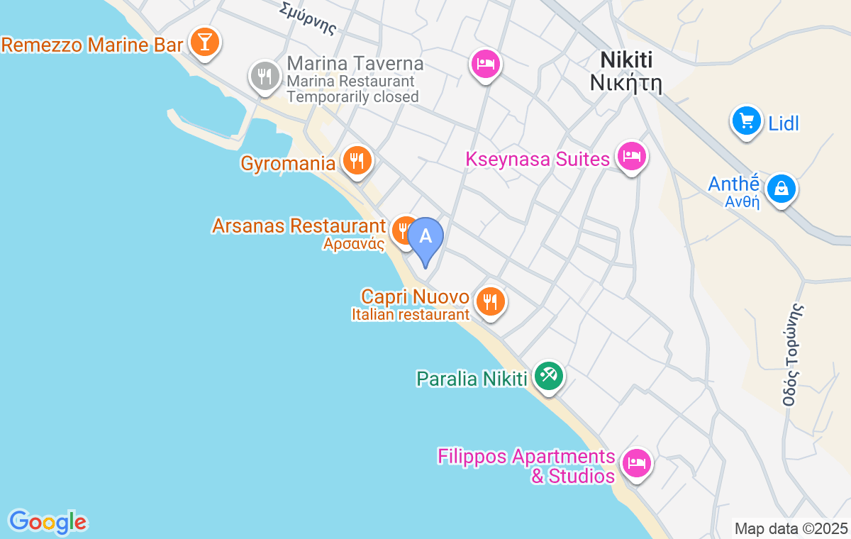 Nakon što prođete semafore na ulazu u Nikiti, produžite pravo dok sa desne strane ne ugledate crkvu. Posle crkve skrenite u ulicu desno i vozite pravo dok ne izađete na ulicu uz plažu, skrenite desno i 15m kasnije ćete videti Karali Studios.