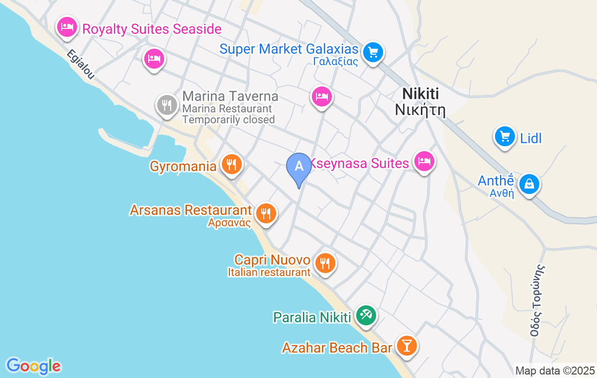 Nalazi se na svega 230m od gradske plaže u Nikitiju, odmah iznad čuvene pekare Zorbas i piljare. Supermarket Galaksias je udaljen oko 700m, a šetališna zona sa brojnim tavernama i barovima je na oko 200m.