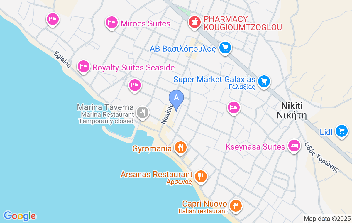 Smeštaj se nalazi na manje od 300m od gradske plaže Nikitija. U neposrednoj blizini, na manje od 200m nalaze se supermarket, pekara, kao i celokupna ponuda letovališta: taverne, turističke radnje, picerija, palačinkarnica, sladoledžinice, električne igračke za decu.