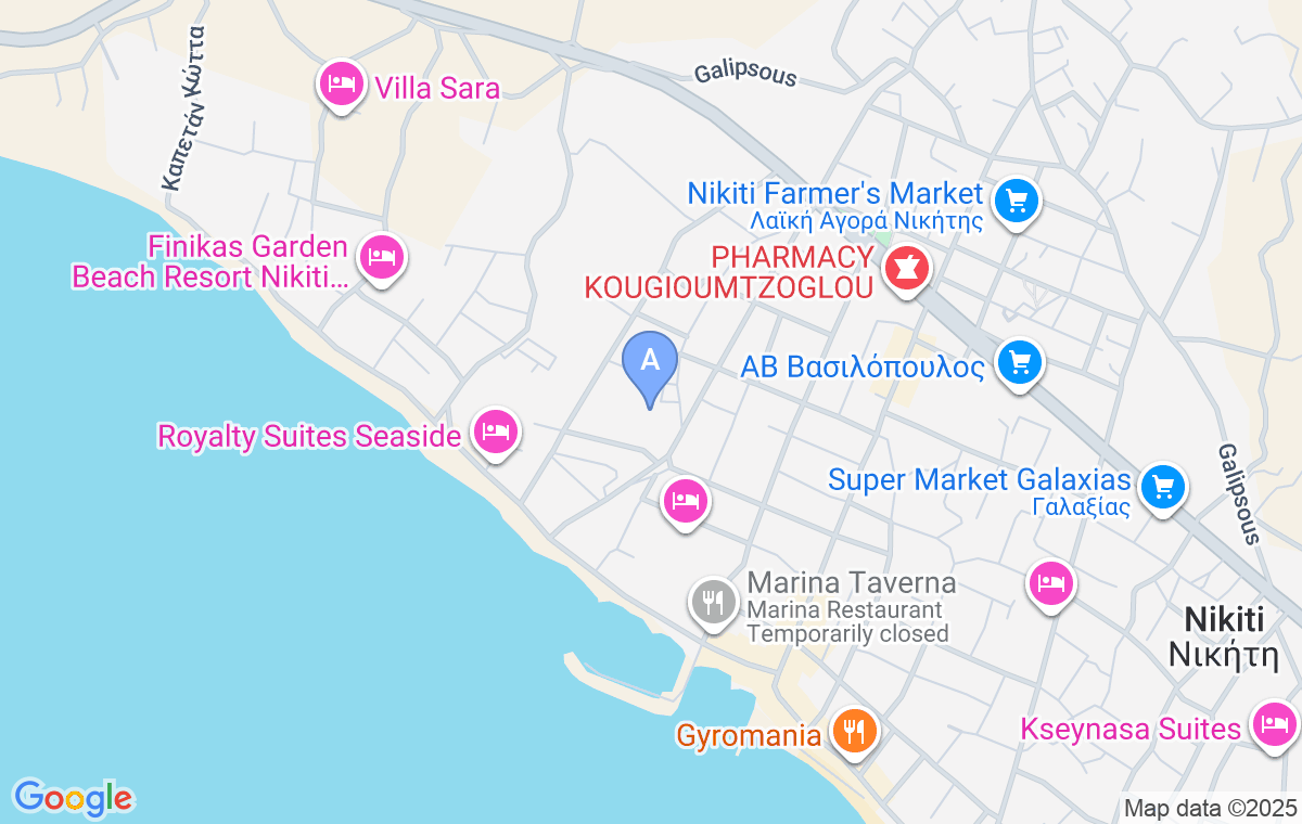 Objekat se nalazi na oko 350 metara od obale i šljunkovite plažice, a početak glavne plaže u Nikitiju, jako lepe i peščane, je na oko 800m. Na istoj udaljenosti su i centar mesta i šetalište kojim se potom lako stiže do svih sadržaja koje ovo mesto nudi. Jedna za drugom nižu se tradicionalne taverne, restorani brze hrane, barovi, turističke radnje i suvenirnice. Na oko 600 metara od smeštaja postoje pekara i dobro opremljen supermarket.