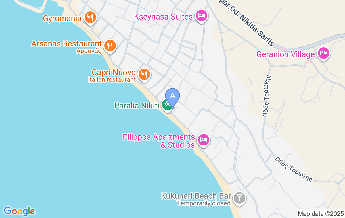 Smeštaj se nalazi negde na sredini lepe plaže u Nikitiju, na oko 1km od strogog centra sa svim sadržajem, na idealnoj lokaciji za savršen odmor, jer nije na prometnom i bučnom mestu, iako je u šetališnoj zoni. Pored smeštaja su kafeterija i picerija Aura.