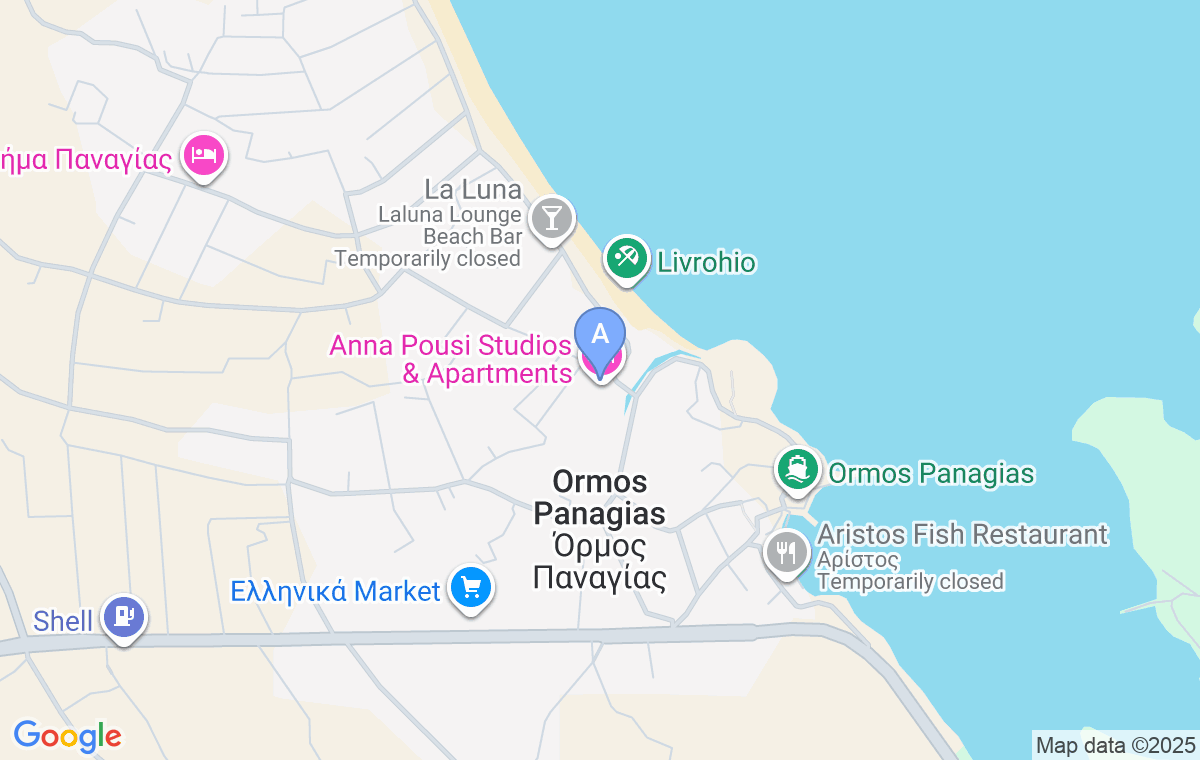 Uđite u Ormos Panagias iz pravca Nikitija tamo gde put vodi ka plaži Trani Amuda (levo), ne do luke. Posle 800m nizbrdo, u ravnom delu, videćete Anna Pousi Studios sa vaše leve strane.