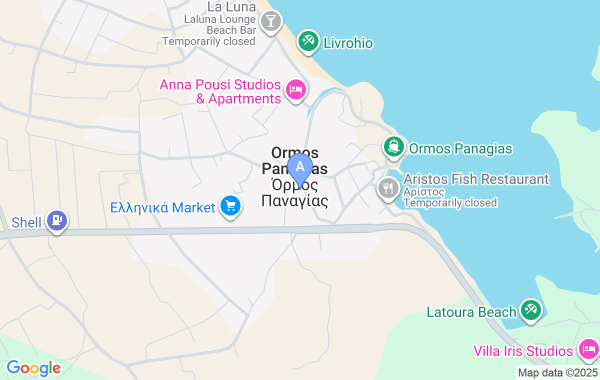 Olympia Studios and Apartments u mestu Ormos Panagias je mala oaza mira, idealna za porodično letovanje. Nalazi se na oko 400m od prelepe plaže Livrohio (Trani Amuda), i na oko 200m od centra Ormos Panagijasa, sa prodavnicama i pekarama. Lokacija smeštaja je idealna za one koji žele da budu u blizini mora, do koga mogu stići laganom šetnjom, a da istovremeno budu izdvojeni i imaju svoju privatnost u dvorištu punom zelenila.