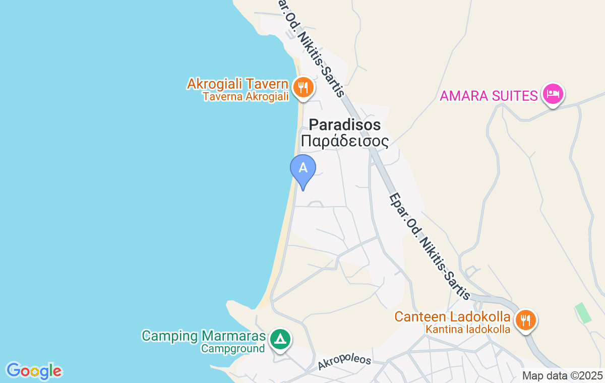 Smeštaj ćete veoma lako naći, nalazi se okvirno u centralnom delu plaže Paradisos, u prvom redu do mora.