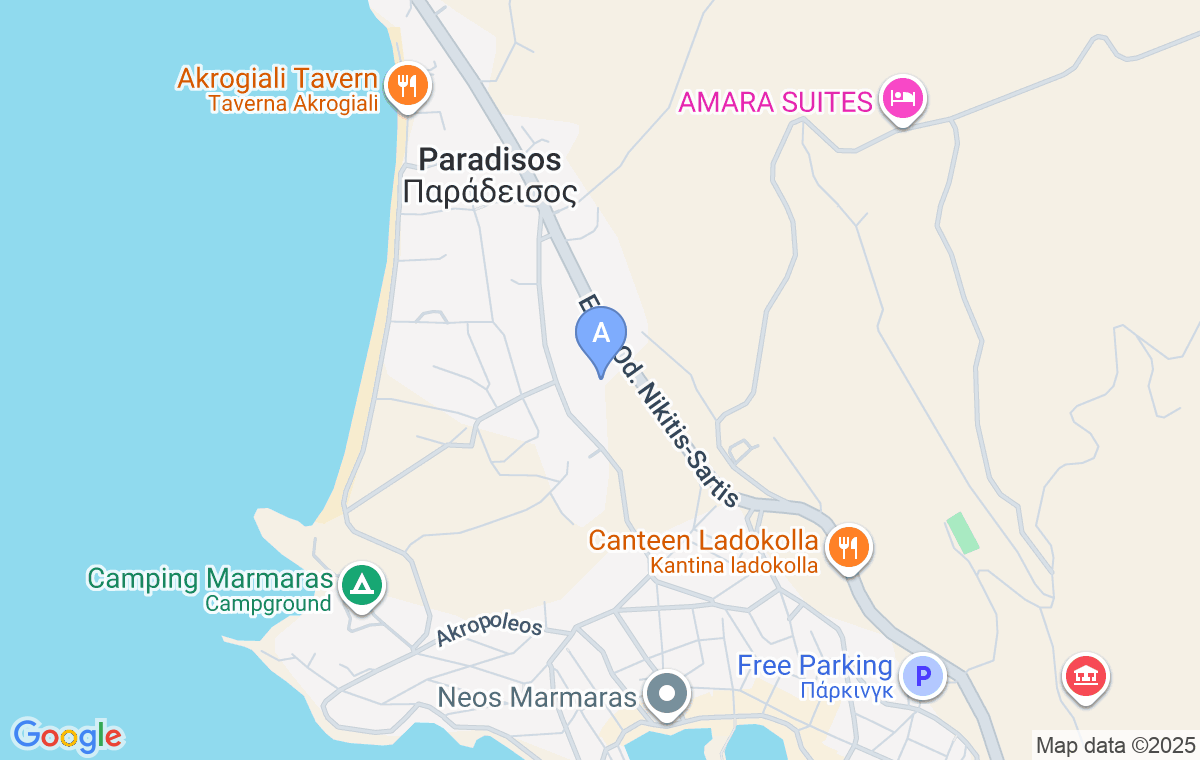 Nalazi se tik iznad magistrale u oblasti Paradisos u Neos Marmarasu. Od plaže Paradisos je udaljen svega 300m, od ulaza u Neos Marmaras 360m, a od supermarketa oko 200m.