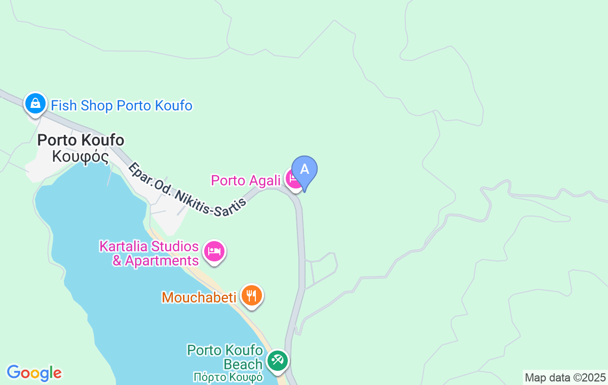 Do smeštaja ćete doći tako što ćete voziti magistralom. Nakon što prođete smeštaj Porto Koufo Resort (iz pravca Sartija) nakon 300m stižete do smeštaja Porto Agali sa Vaše desne strane.