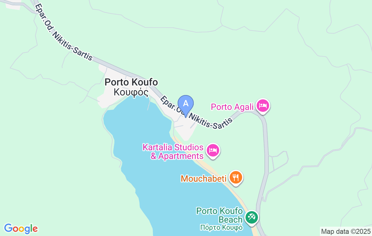 Smeštaj je udaljen 200m od plaže i 350m od najbližeg marketa i poznatih taverni. Plaža je peskovita i uska, ali je ulaz u vodu kamenit u nekim delovima.