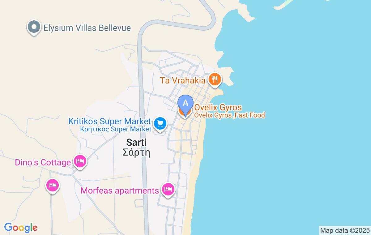 Dolazeći iz pravca Vurvurua, skrenite sa magistrale kod kluba Fact i nastavite pravo do kraja. Uđite u ulicu koja vodi ka moru, pa skrenite u prvu ulicu levo i 50m kasnije, sa leve strane, videćete palačinkarnicu iznad koje se nalazi Nikos House.