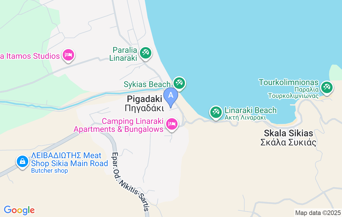 Kada skrenete sa magistrale ka plaži Sikija, nastavite pravo ka plaži. Naići ćete na račvanje puteva, gde put levo vodi ka plaži Sikija, a put desno, uzbrdo ka ostalim uvalama. Nastavite levo i nakon 150m ćete videti ovaj smeštaj sa desne strane.