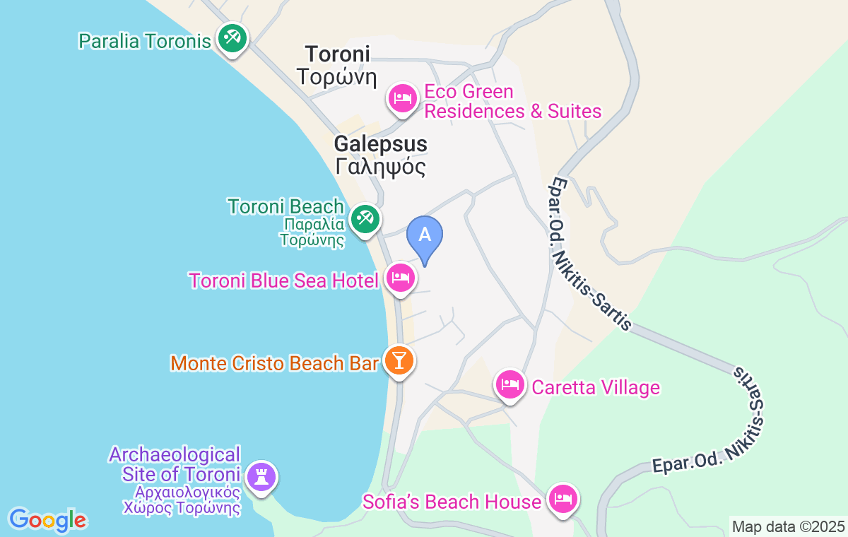 Nakon što uđete u Toroni, vozite ulicom pored plaže do kafeterije u sklopu Toroni Paradise Studios. Marea Apartments je u dvorištu iza.
