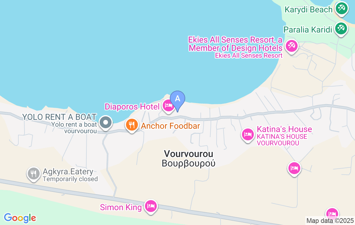 Nakon što prođete market na magistralnom putu u Vourvourou, skrenite levo i vozite sve dok ne stignete do smeštaja koji se nalazi sa vaše leve strane.
