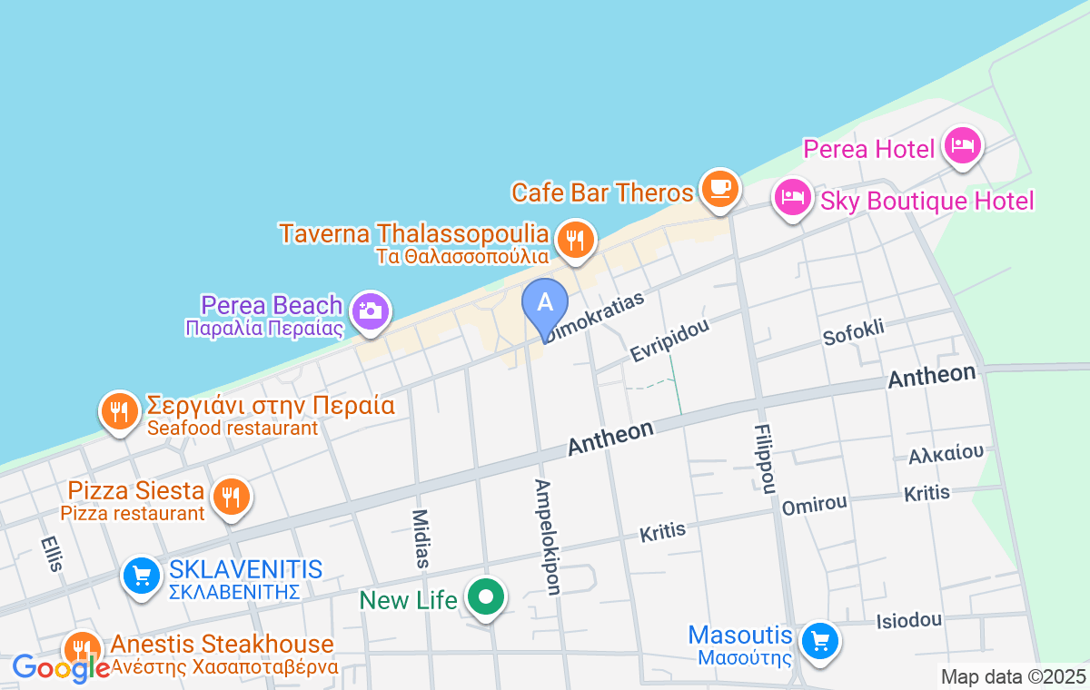 Apartman se nalazi pored najšireg dela plaže u Perei. U neposrednoj blizini se nalazi kafić Theros, ali i brojni drugi restorani duž plaže. Najbliži market i apoteka su 50m udaljeni od apartmana, kao i veliki park za decu, pekare i poslastičarnice. Do centra mesta je potrebno 5 minuta hoda.