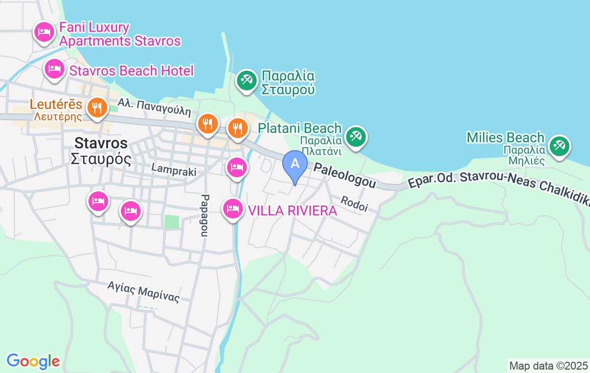 Kako biste našli smeštaj, kada stignete do kružnog toka u centru Stavrosa i pređete mostić, skrenite u ulicu desno nakon marketa. Stegiovana mezonete su u drugoj ulici, paralelnoj sa onom iz one koje ste skrenuli.