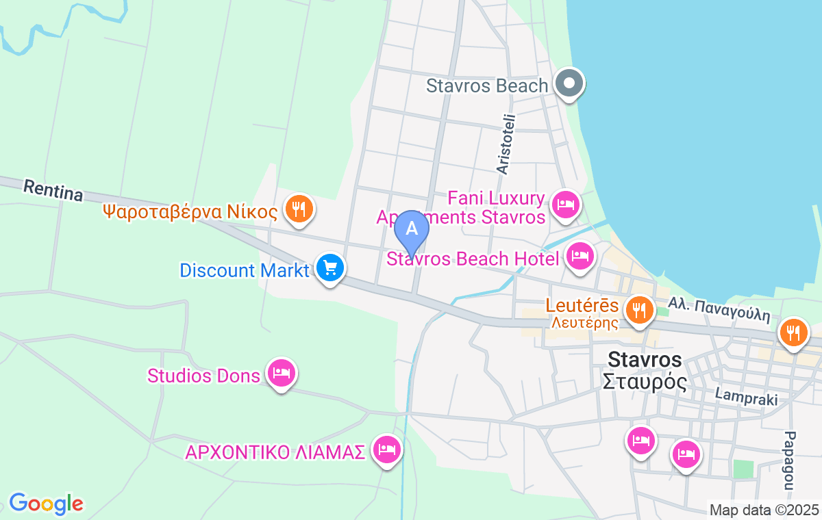 Kako biste stigli do objekta, na ulazu u Stavros, pre placa sa gliserima i jahtama, a posle marketa Arvanitidis, skrenite levo i vozite pravo oko 40m dok ne vidite ovaj smeštaj na uglu sa leve strane.