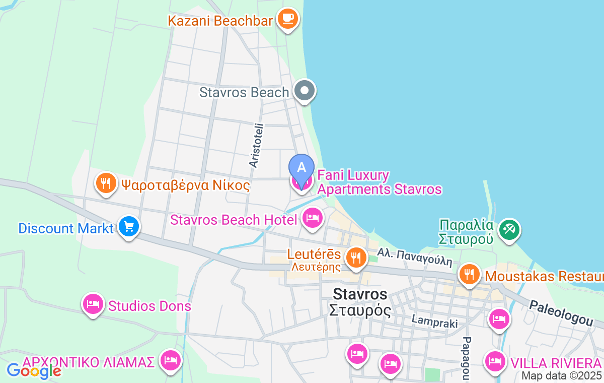 Fani Luxury Boutique je nov i luksuzan smeštaj u Stavrosu, na samo 20m od plaže. Nudi sedam soba i studija sa pogledom na planinu i bočnim pogledom na more. Doručak na bazi švedskog stola se služi u sali za doručak ili na terasi ispred. Pogodnosti uključuju dvorište sa ograđenim prostorom za decu sa igračkama, prenosivi roštilj i privatni parking sa dovoljno mesta za sve.