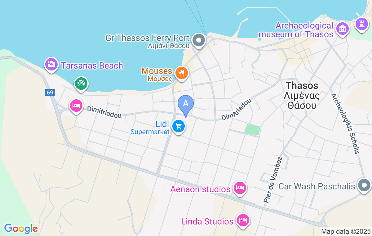 Kada izađete sa trajekta, pratite pravac udesno i vozite pored mora glavnim putem (oko 300 metara). Kada dođete do dela gde uži put pravo vodi ka hotelu Vournelis i istoimenoj plaži, nastavite glavnim putem i skrenite ulevo. Nakon oko 150 metara ćete naići na prvu veliku raskrsnicu (sa ulicom Dimitriadu) i tu skrenite levo. Posle stotinak metara ćete stići do vile Elia, koja se nalazi sa desne strane puta koji vodi ka Prinosu.
