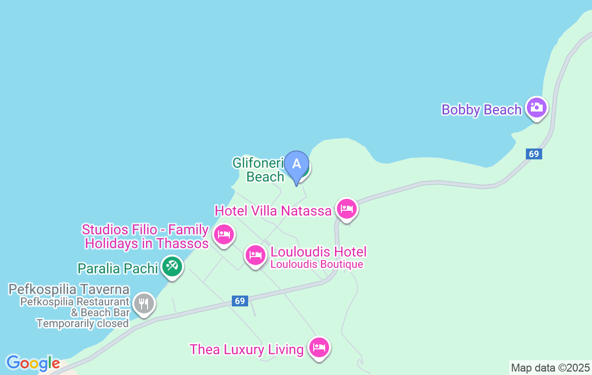 Udaljena je 9km od Limenasa prema zapadu. Vozeći od Limenasa sa magistrale treba skrenuti desno kod znaka za hotel Louloudis, a posle nekih 150m ponovo desno. Vozite putem još 500m i izlazite pravo na prelepu plažicu. Pratite znak za tavernu Glifoneri.