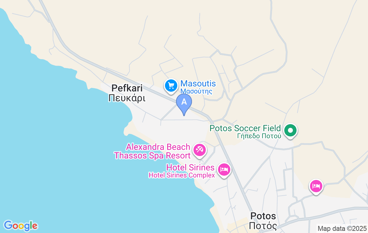 Lokacija ove kuće je odlična, s obzirom na to da se nalazi na 5 minuta hoda od plaže, Potosa i Pefkarija, a i automobilom joj je lako prići. Gosti mogu da biraju da li će se kupati na gradskoj plaži u Potosu, plaži hotela Alexandra Beach, levoj ili desnoj uvali Pefkarija. Sve ove plaže su dostupne peške. Veliki supermarket Masoutis je udaljen 200m.