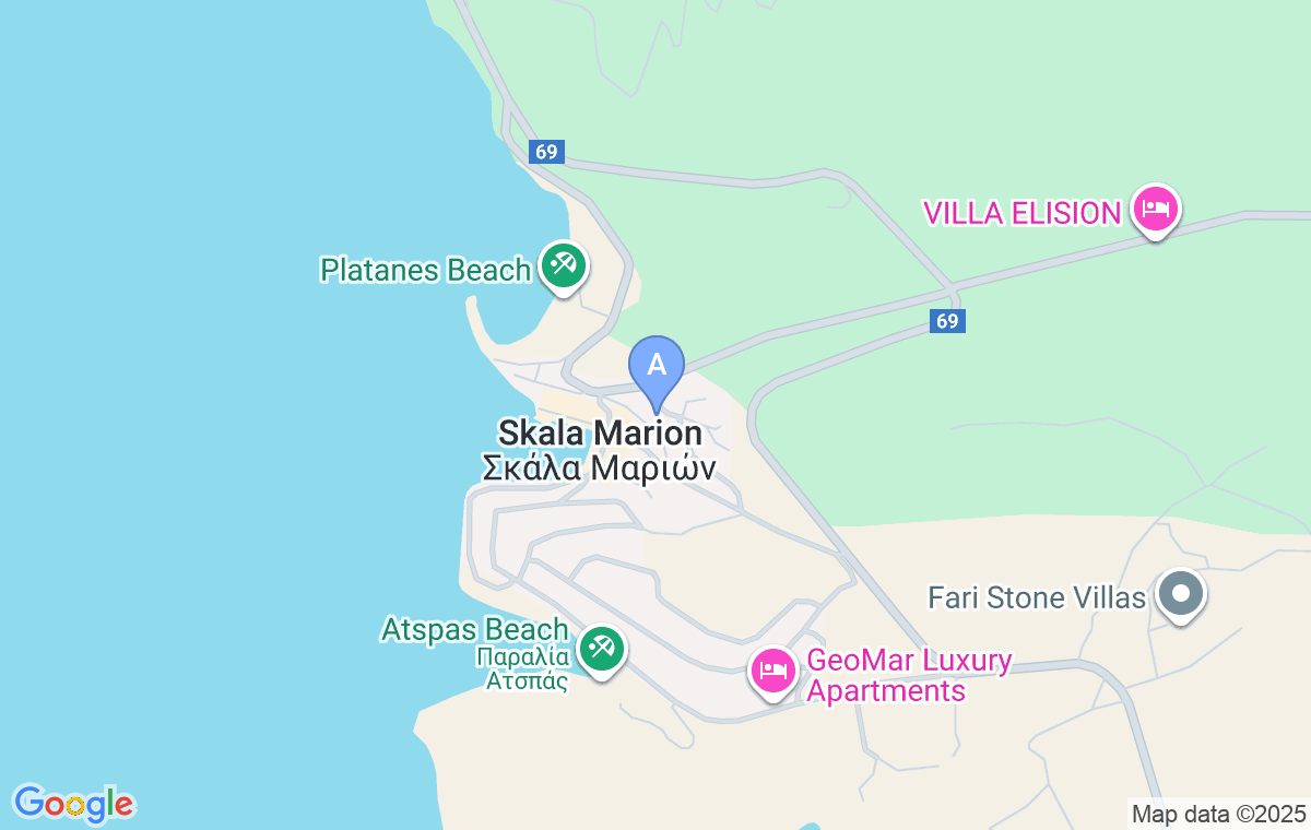 Magda Studios se nalazi u centru Skale Maries u neposrednoj blizini gradske i Platanes/Sunset plaže. U pitanju je klasičan apartmanski smeštaj, ali vrlo čist, sa lepim dvorištem i prostranim balkonima.