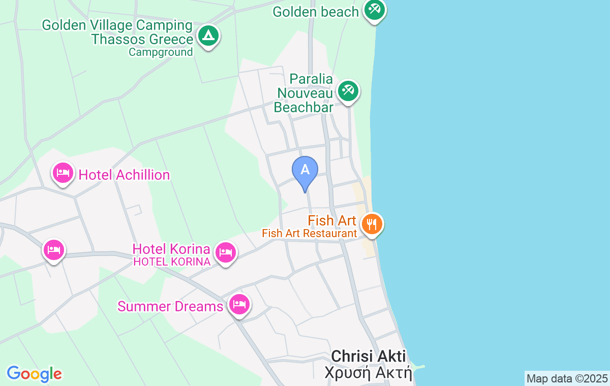 Smeštaj se nalazi u Skali Potamiji, koja je deo velikog zaliva Golden Beach, pa je i samo mesto Golden Beach blizu. Od plaže je udaljen 250m a od najpopularnijih barova u Skali Potamiji, Paralia Nouveau i La Boheme, nekih 500m. Prva prodavnica je udaljena 400m a na istoj udaljenosti se nalazi i veliki market SPAR, koji je opremljeniji od prodavnice.