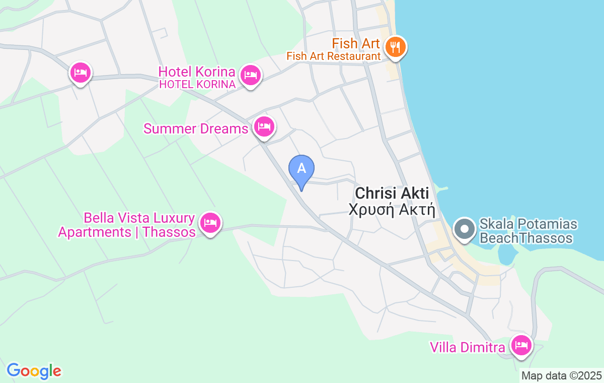 Kada dođete do centralne raskrsnice u Skali Potamiji (iz pravca plaže Golden beach), skrenite levo, pa onda u prvu ulicu levo. Nakon 200-300m videćete vilu Elegia sa leve strane ulice, tu skrenite levo i vozite pravo nekoliko stotina metara do apartmana Eric’s.