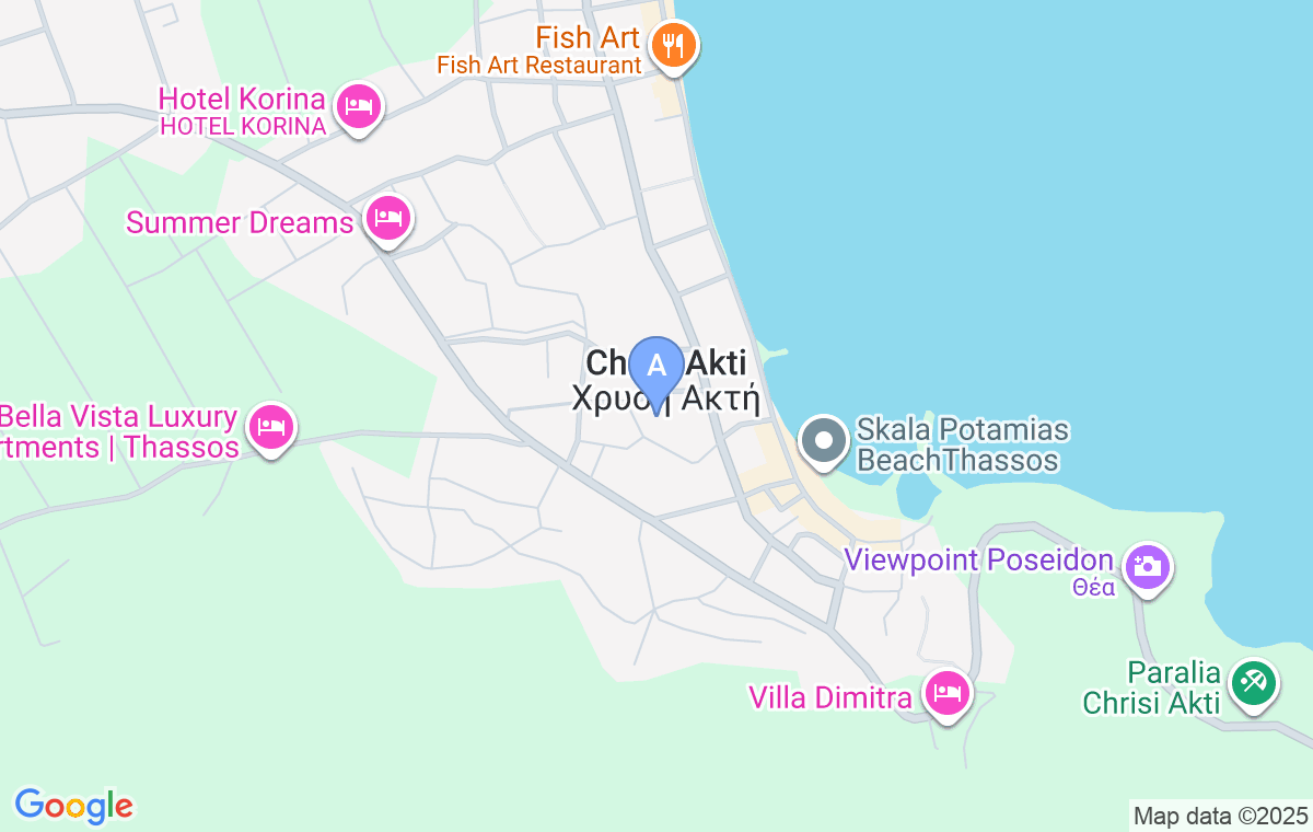 Nakon što dođete do centralne raskrsnice u Skali Potamiji (iz pravca plaže Golden beach), skrenite levo, a zatim u prvu ulicu levo. Nakon 300-400m, videćete vilu Elegia sa leve strane ulice. Irida Apartments je odmah iza nje.