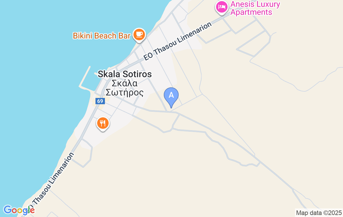 Dolazeći iz pravca Prinosa skrenite levo na glavnoj raskrsnici u Skali Sotiros i vozite pravo još nekih 400m, nako čega ćete videti hotel sa leve strane puta.