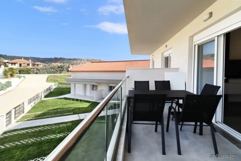 Balkon apartmana nudi prijatan kutak za odmor, sa pogledom koji obuhvata okolinu i pruža osećaj izdvojenosti od svakodnevne vreve. Opremljen udobnom garniturom za sedenje, ovaj prostor poziva na opuštene trenutke uživanja, bilo uz prvu jutarnju kafu dok se mesto polako budi ili tokom mirnog večernjeg predaha dok letnja atmosfera lagano ispunjava okruženje.