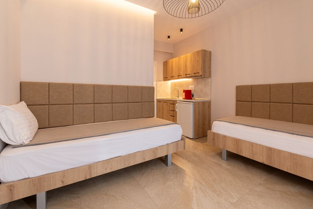 U ponudi se nalazi jedan četvorokrevetni studio, pet trokrevetnih studija i osam dvokrevetnih studija, kao i dva četvorokrevetna apartmana. Četvorokrevetni studio Superior ima jedan francuski ležaj i krevete na sprat i nalazi se na drugom spratu (treci, top floor). Trokrevetni studio Superior ima francuski i singl ležaj, nalazi se, takođe, na drugom spratu (treci, top floor). Dva trokrevetna studija imaju po jedan francuski i po jedan singl ležaj se nalaze na visokom prizemlju (prvi sprat), a dva se nalaze na prvom spratu (drugi sprat). Osam dvokrevetnih studija je raspoređeno na visokom prizemlju (prvi sprat) i prvom spratu (drugi sprat).