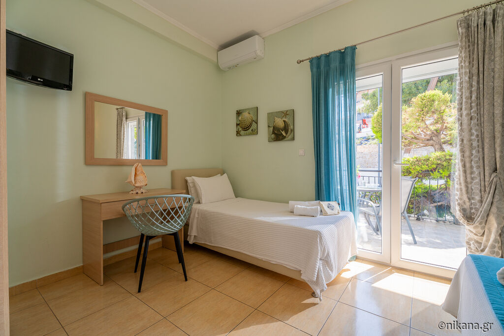 Gradska plaža je udaljena nešto više od 1km, dok je plaža Paradisos na oko 600-700m. Postoji i jedna mala neuređena plaža u uvali na manje od 400m, nije baš popularna, ali može da se koristi. Na pešačkoj udaljenosti, na samo par minuta hoda, nalaze se brojni restorani, barovi, taverne, pekara, apoteka, supermarketi i prodavnice koje su otvorene do kasno.