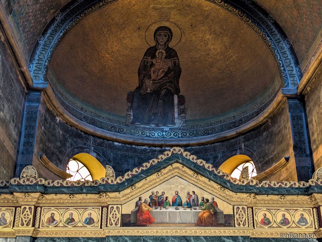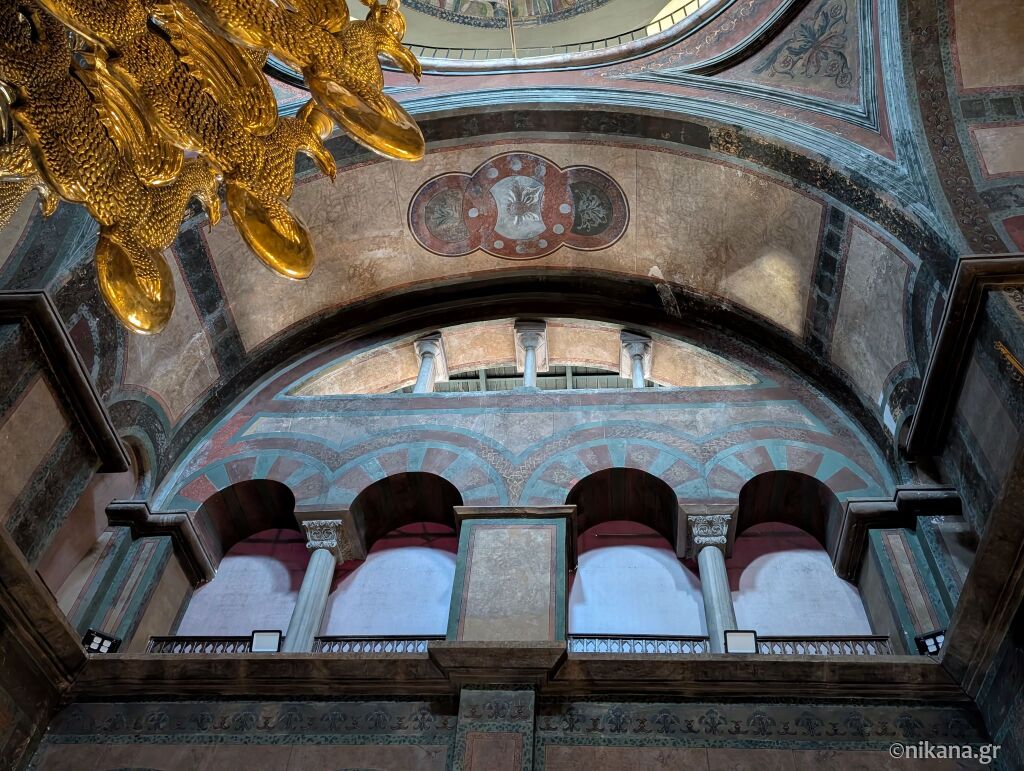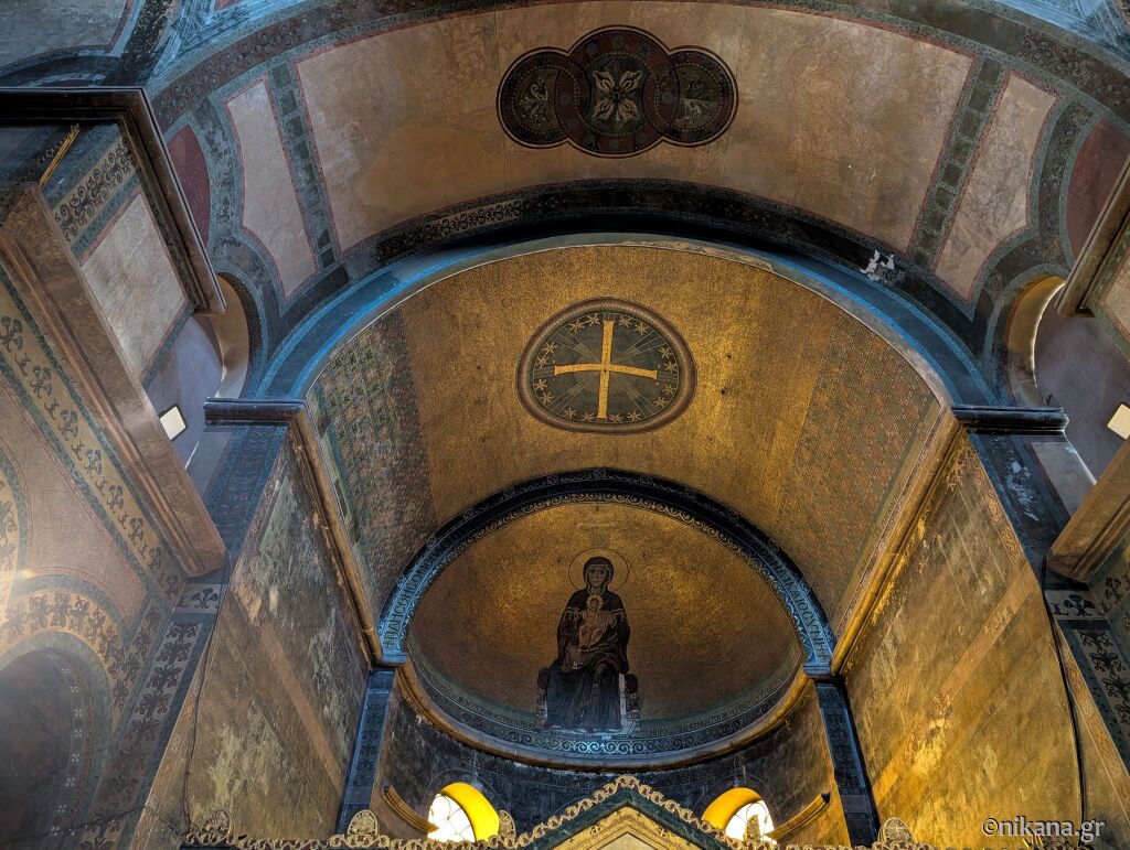 Unutrašnjost crkve krase prelepi mozaici i freske, od kojih su mnogi iz perioda vizantijskog carstva. Posebno je impresivan mozaik u kupoli, koji prikazuje Vaznesenje Hristovo, jedan od najvažnijih prizora vizantijske umetnosti.