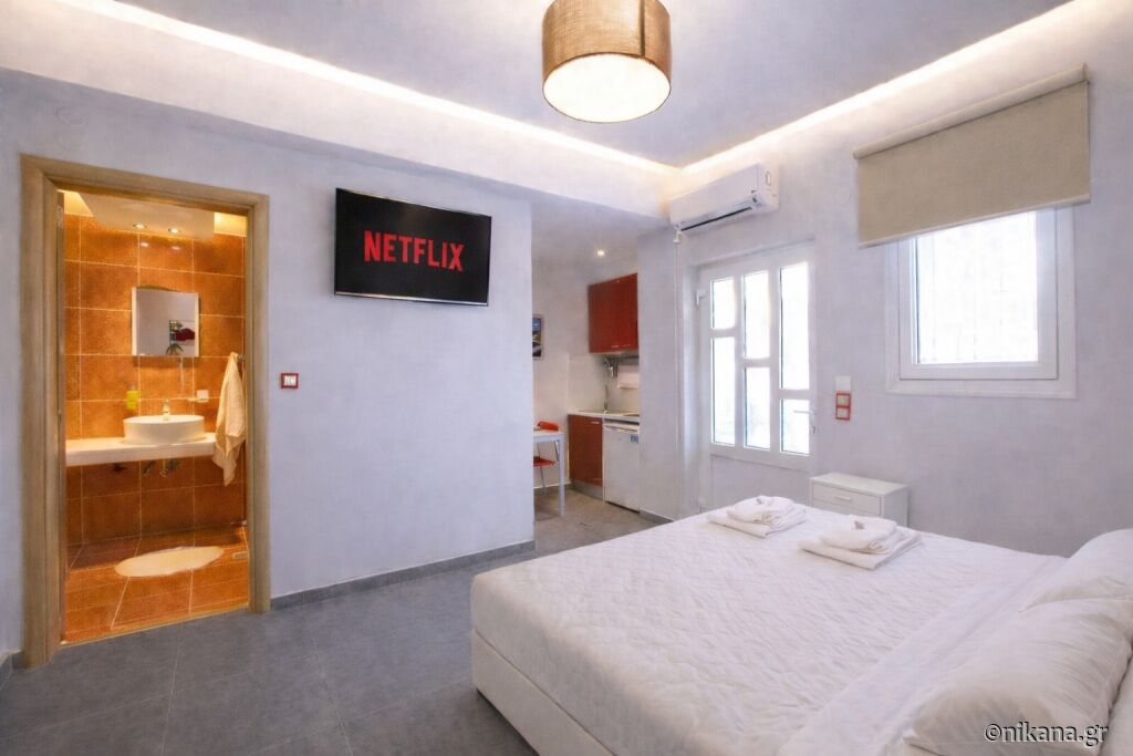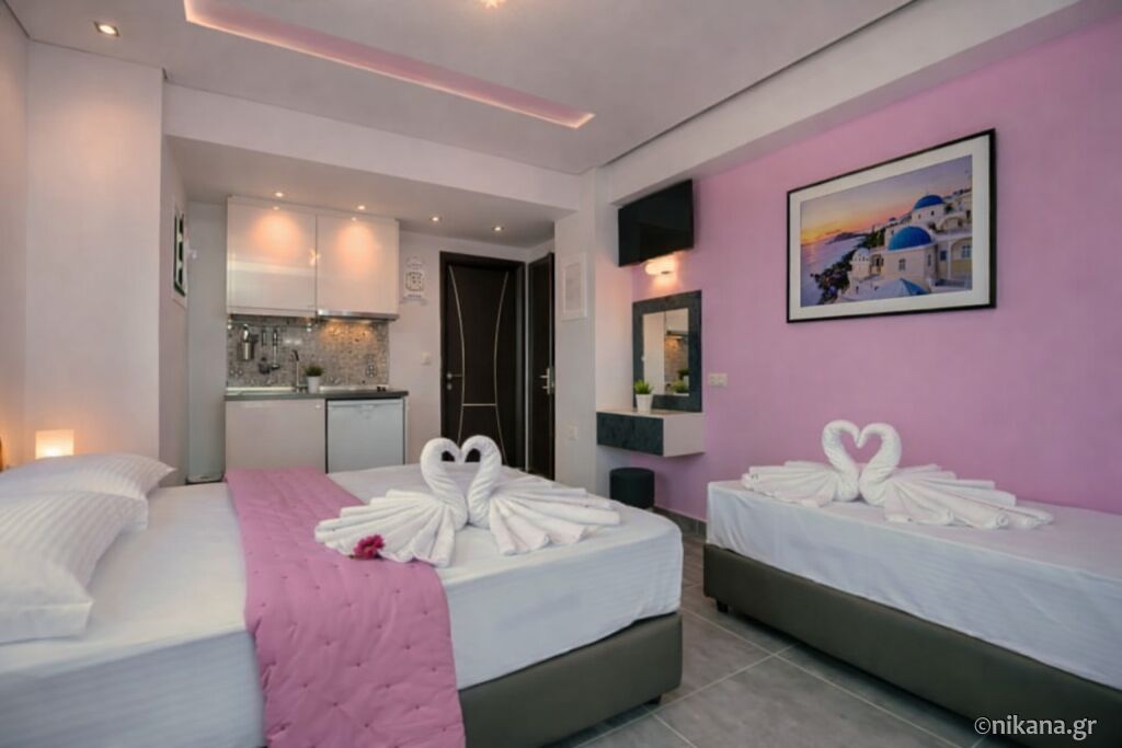 Trokrevetni studio ima površinu od 22m2, nalazi se na spratu i ima pogled na more sa terase. U okviru prostorije su jedan francuski i jedan singl krevet. Kuhinja je opremljena. Ima mali frižider i rešo. U kupatilu postoji tuš kabina.